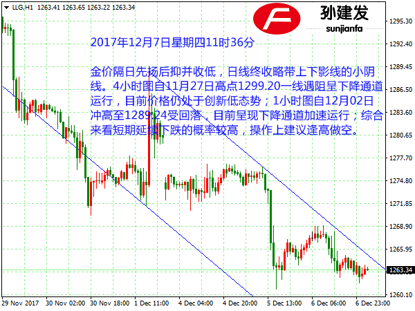 黄金/美元(XAUUSD):金价隔日先扬后抑并收低,日线终收略带上下影线的中阴线。4小时图自11月27日高点1299.20一线遇阻呈下降趋势运行,目前价格仍承压于MA21下方呈创新低态势;1小时图低位区间下破后的回抽确认,目前价格仍承压于MA21和MA55下方;综合来看短期延续下跌的概率较高,操作上建议逢高做空。
