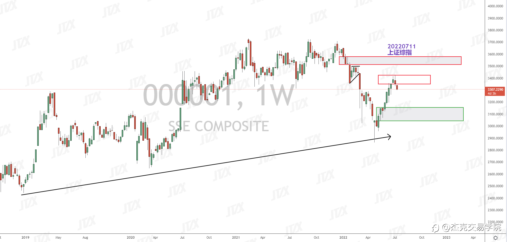 上证周图,价格跌破周图需求区后,关注价格回抽周图看跌吞没,价格不破会继续走空,关注更下方需求区3411附近做多机会。