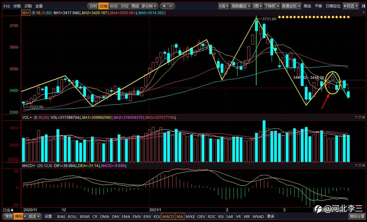 于是有了B中枢的构建,之后c段的离开,相对b段,即使用肉眼也可以看出力度存在明显的不足,所以本次回踩的目标是B中枢的上沿,我们的剧本是至于能不能反转要看背驰后的回踩,能否突破B中枢,并形成有效的三卖。