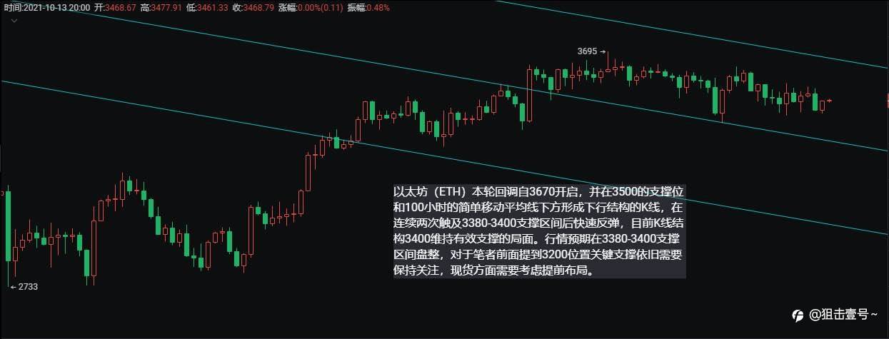 #ETH/USD# 以太坊(ETH)在经过隔夜回踩3400位置后,目前3400和3370的水平上方仍然受到良好支撑。在ETH/USD的小时图上有一个主要的看跌通道形成,阻力位在3520附近如果明显突破3540和3550后持续拉伸的局面,大概率会提前结束本轮回调。同样本周以来的盘整局面同样在3530-3560位置形成了短线压力区间,若短线上没有新的能量助力以太坊(ETH)突破该压力区间,上方空间依旧不会被打开。