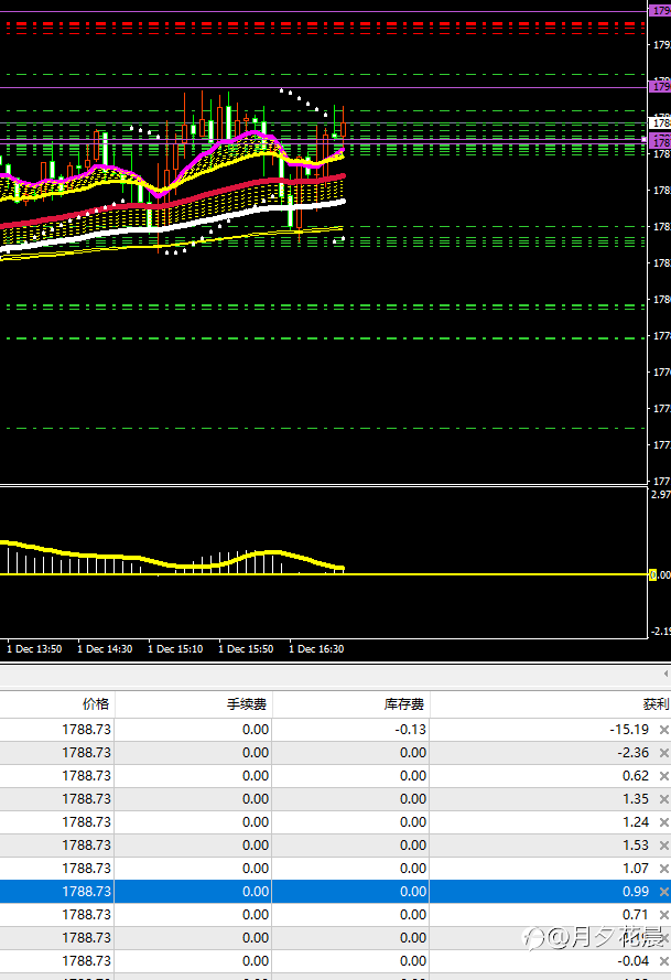 第二次必须做多,参考RSI线,以及在急跌之时迅速形成了下影线,并且5分钟周期里面,K线已经偏离紫线很远,一般反弹高度为接触到紫线的地方,在做止盈。