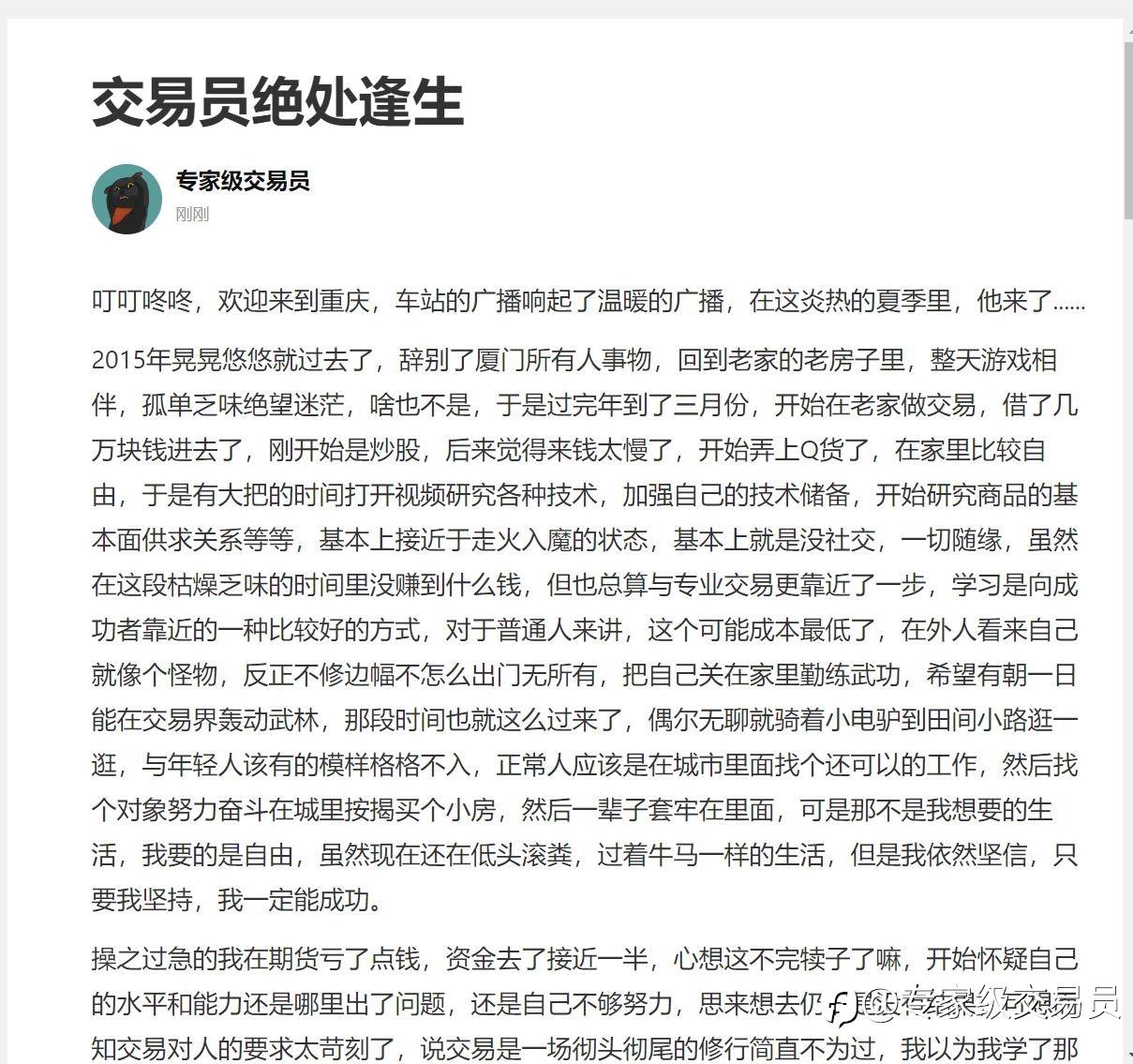 有时候我时常在想,除了做交易,还有没有什么好的工作,不一定要求大富大贵,能勉强过上好日子的工作,但后面想了想,我怎么可能低下头去赚一月三五千的薪资;后来我发现这很可怕,一个没有条件改变现状的农村孩子,坐在办公室吹着空调,好的时候一月赚十万块钱,这是什么样的一种感受,这是自信心何等的膨胀,以至于我后面被市场毒打爆仓,经历种种不堪。不是我没操盘能力,而是暴富的心态,买车买房娶白富美的欲望吞噬了我的理智。做交易的过程中参杂了太多的东西进去了,让交易不再单纯的是交易,这就违背了交易的初衷,把好好的交易事业和赌博划上了等号,最终交易失败穷困潦倒,连一份可以糊口的工作都没有,好可怜。