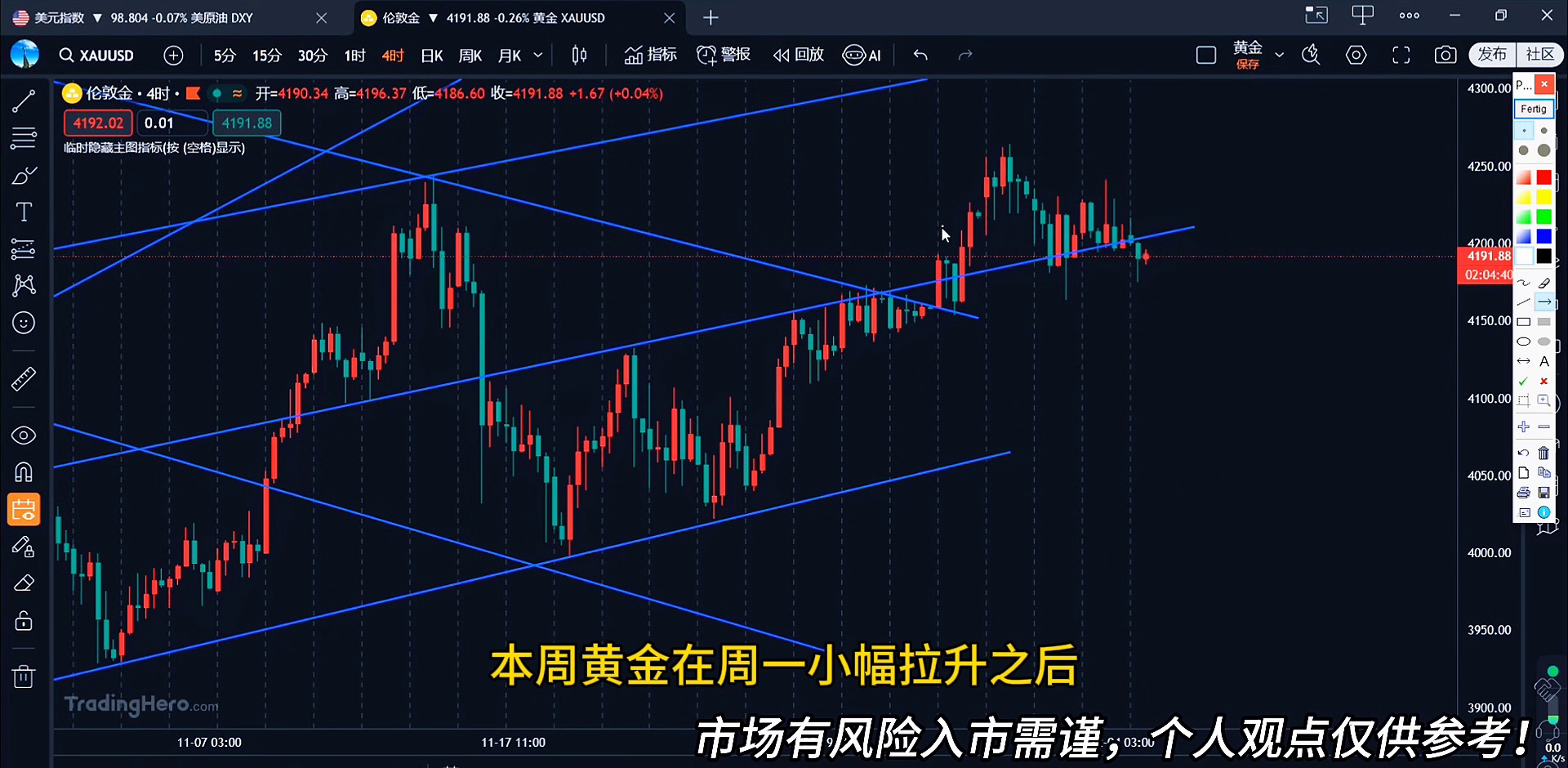 最后再强调一点,当前黄金多头行情主要受关税政策刺激,避险情绪升温导致黄金上涨。所以一定要关注最新的消息面,如果后续出现关税政策缓和或有谈判的苗头出现,那么势必会有一波较大幅度回撤,因此一定要注意风险控制,顶在哪里谁也不知道,只能通过每一波上升幅度初步判断风险区域和压力位。