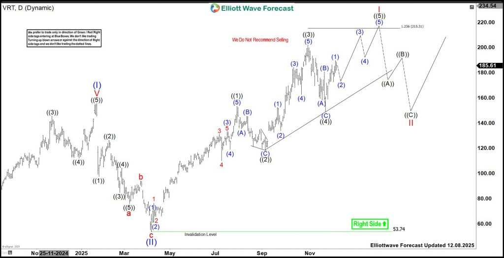 The first impact from the February high was a clear 3-swing decline that ended at the extreme area where we recommended members should buy for some profit.. Price rallied from the extreme as expected. Members reached the first target and are running a risk-free trade after taking partial profit. Going forward, the debate is whether the rally will be corrective or impulsive toward the February high. The chart below shows the scenario where wave ((II)) already finished at the April 2025 low.