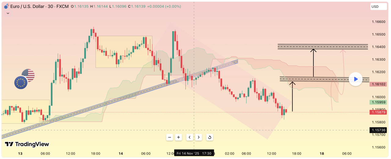 Sau cú bật tăng mạnh từ vùng tích lũy 1.3180, giá đã tạo cấu trúc đáy cao mới. Nhịp điều chỉnh gần đây khá nông, thể hiện lực mua vẫn hiện diện nhưng đang chờ điểm vào lệnh thuận lợi hơn. Một mô hình điều chỉnh đang hình thành gần kháng cự – cấu trúc thường thấy trước khi giá retest vùng cầu động.