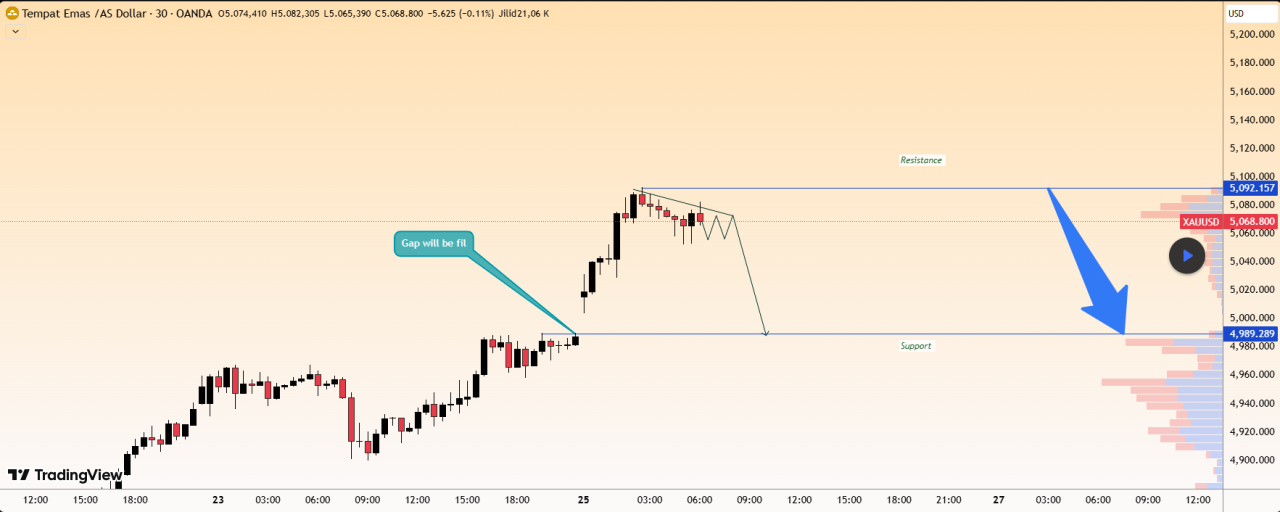 Emas berkonsolidasi di bawah zona resistensi yang kuat. Harga gagal menembus lebih tinggi dan menunjukkan kelemahan, dengan kemungkinan kemunduran diperkirakan akan mengisi celah dan menguji ulang area support sekitar 4989. Bias tetap bearish di bawah resistance kecuali jika terjadi breakout yang jelas.