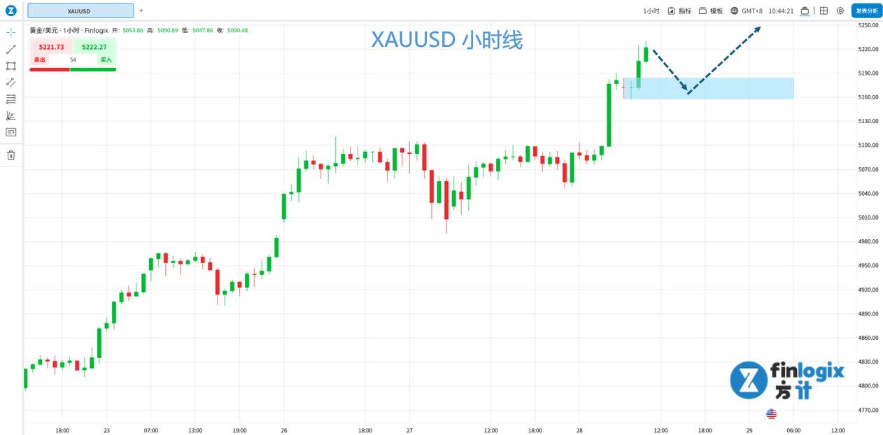 技术面:早盘北京时间9:00继续拉升,突破5200美元大关,当前市场环境下,黄金短线仍持续偏多,早盘的拉升小时K线可视为日内关键K线,不想直接追多者,可考虑稍后价位回踩5160~5180区间时,有考虑做多的机会。