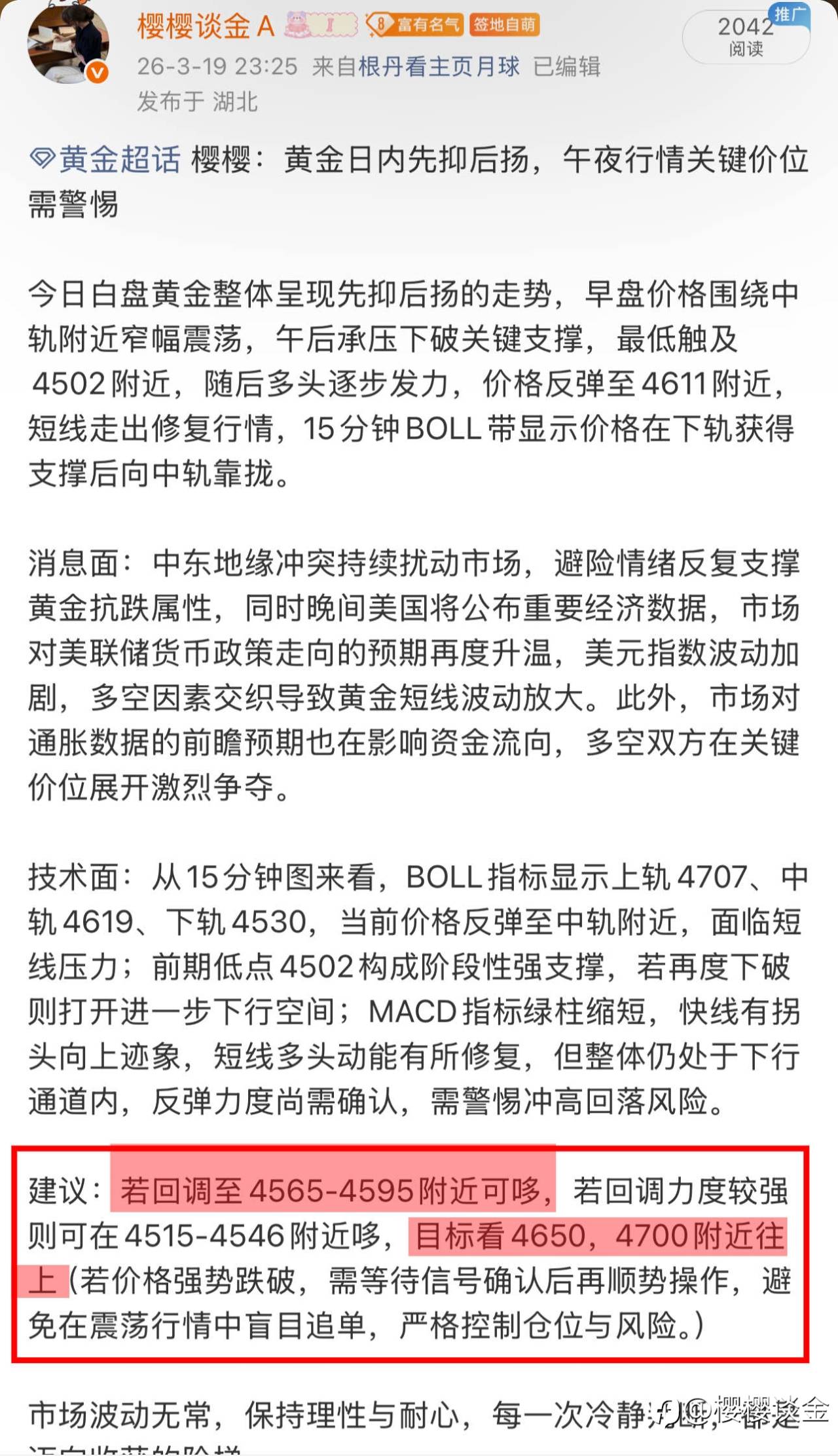 樱樱:白盘冲高回落,黄金短线支撑位在哪里?