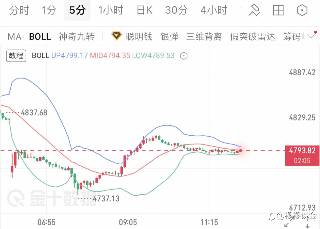 日内黄金冲高回落,最高触及480后承压下行,最低下探4767,当前交投于4783附近,价格运行于布林带中轨下方,短线空头占优但下方支撑尚未破位。