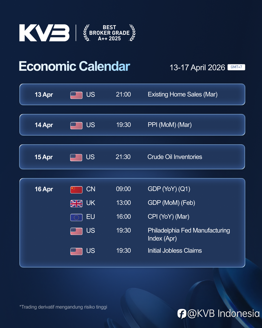 Peringatan Risiko: Perdagangan berjangka dan komoditas memiliki tingkat risiko yang tinggi dan mungkin tidak sesuai untuk semua investor. Penggunaan pengungkit (leverage) dapat bekerja untuk keuntungan Anda, namun juga dapat berisiko terhadap modal Anda. Sebelum memutuskan untuk bertransaksi, Anda harus mempertimbangkan tujuan investasi, tingkat pengalaman, dan toleransi risiko secara bijak. Segala bentuk kerugian yang timbul merupakan tanggung jawab pribadi, dan KVB Futures tidak bertanggung jawab atas keputusan investasi yang diambil secara mandiri oleh nasabah.
