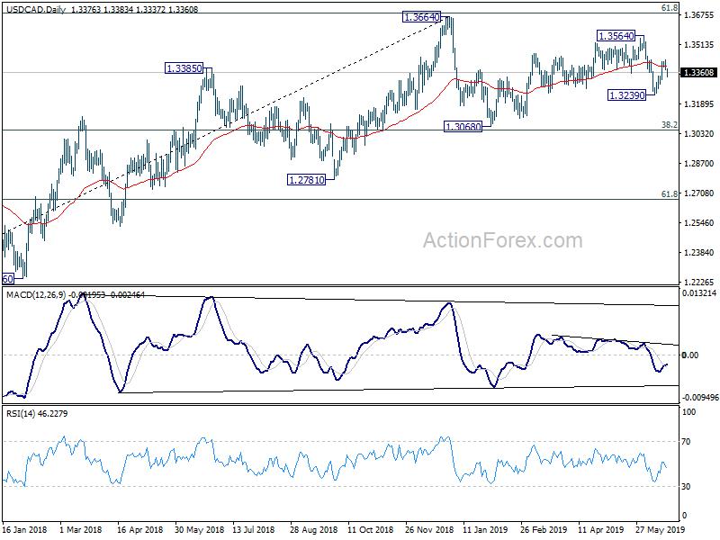 In the bigger picture, outlook is turned mixed after USD/CAD drew strong support from 55 week EMA (now at 1.3232) and rebounded. Nevertheless, sustained break of 61.8% retracement of 1.4689 (2016 high) to 1.2061 at 1.3685, is needed to confirm resumption of up trend from 1.2061 (2017 low), towards 1.4689. Otherwise, medium term outlook will stay neutral first. Break of 1.3239 will revive the case of medium term topping at 1.3664. And, decisive break of 1.3068 cluster support (38.2% retracement of 1.2061 to 1.3664 at 1.3052) will confirm and pave the way to 61.8% retracement at 1.2673 next.