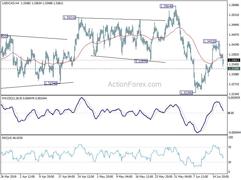 USD/CAD drops notably today but stays above 1.3328 minor support. Intraday bias remains neutral first and another rise is still in favor with 1.3328 minor support intact. Above 1.3432 will resume the rebound from 1.3239 to 1.3564 resistance next. On the downside, below 1.3328 minor support will turn intraday bias back to the downside for 1.3239 support instead.