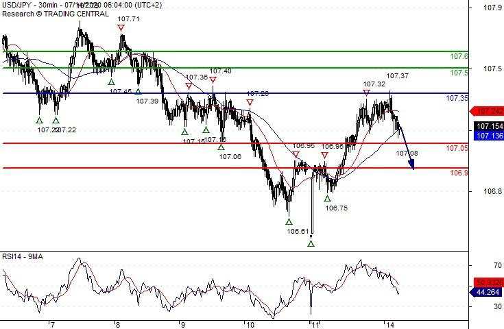Short positions below 107.35 with targets at 107.05 & 106.90 in extension.