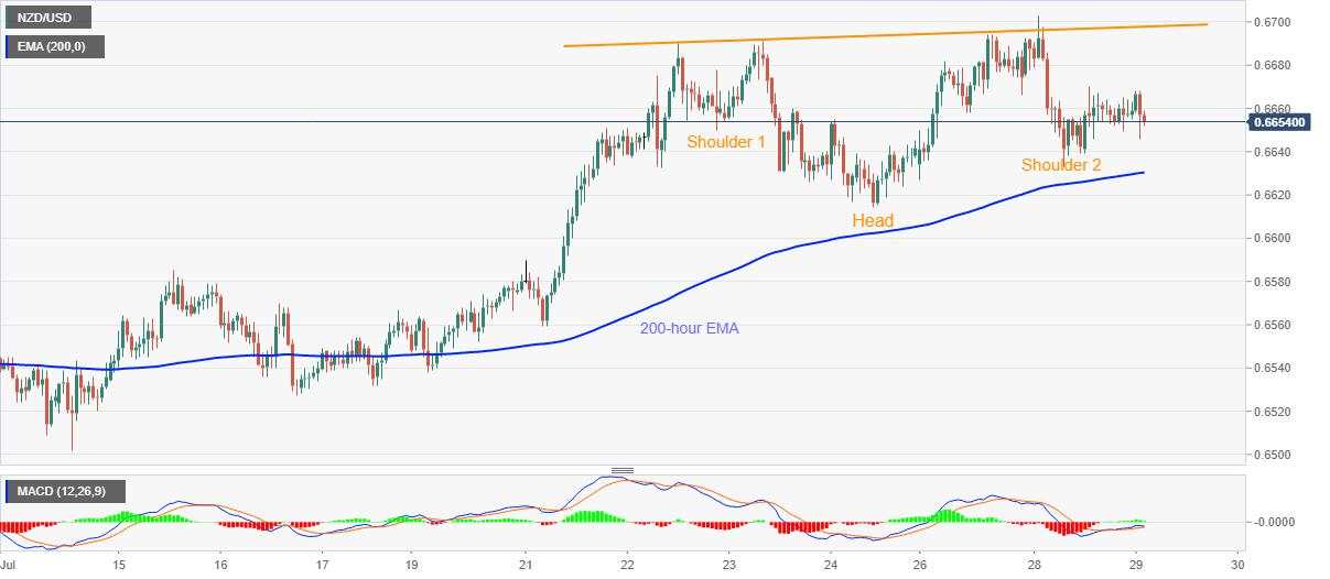 NZD/USD weakens to 0.6655 amid the initial trading session on Wednesday. The quote recently dropped to the intraday low of 0.6646 on downbeat fundamentals from its largest customer Australia. Though, sustained trading beyond near-term key moving average and bullish MACD keeps the buyers hopeful to gain confirmation of a bullish pattern.