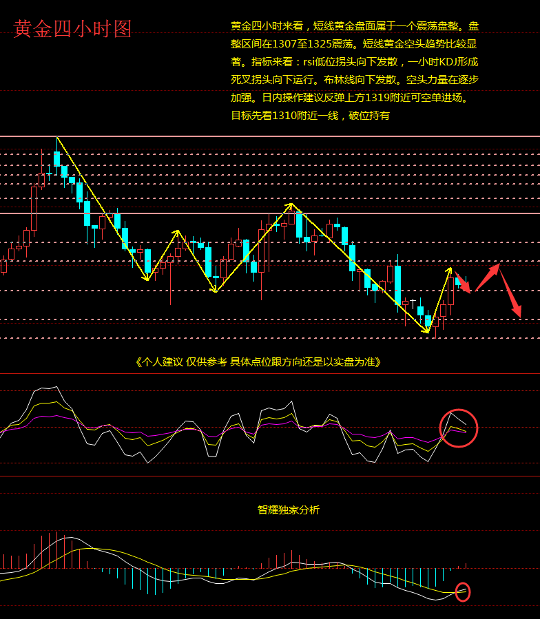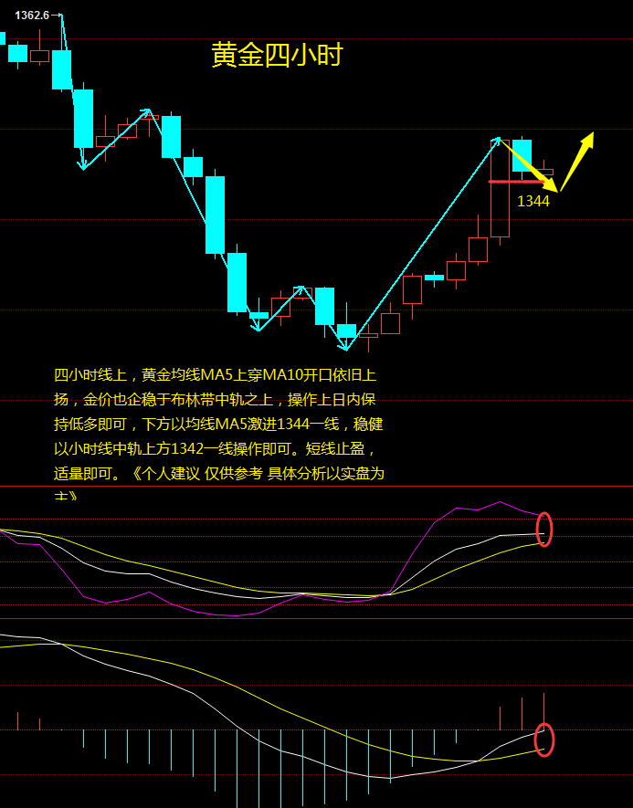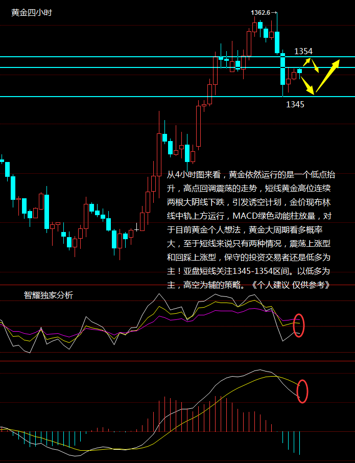 金价分析与策略:今日早盘小幅高,从日线来看MA5,MA10形成金叉上扬,亚盘MA5均价在布林线上轨下方运行。而布林线三线保持一个平行状态,从指标来看:RSI金叉向上同时已出现持续走平,KDJ预形成死叉,从日内分析,亚盘的走势会有震荡回调的可能。从4小时图来看,黄金依然运行的是一个低点抬升,高点回调震荡的走势,短线黄金高位连续两根大阴线下跌,引发诱空计划,金价现布林线中轨上方运行,MACD绿色动能柱放量,对于目前黄金个人想法,黄金大周期看多概率大,至于短线来说只有两种情况,震荡上涨型和回踩上涨型,保守的投资交易者还是低多为主!亚盘短线关注1345-1354区间。以低多为主,高空为辅的策略。《个人建议 仅供参考》