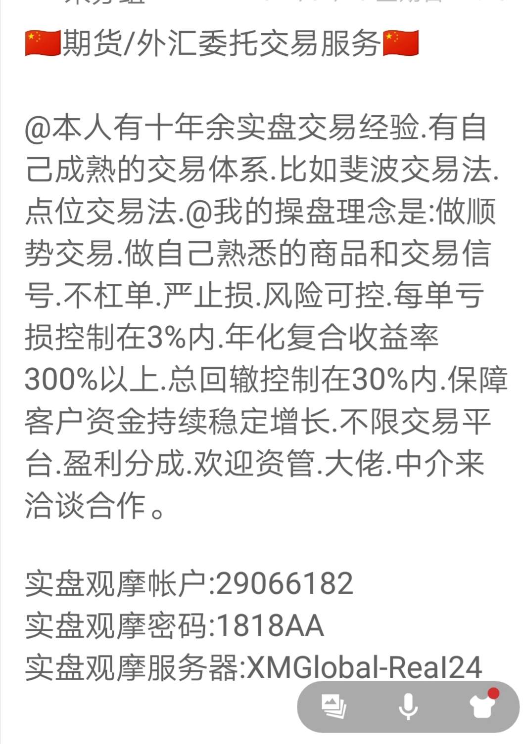 @我们的操盘理念是:只做顺势交易.做自己熟悉的商品和交易信号.不杠单.严止损.风险可控.单笔风险控制在3%内.年化收益率300%以上.确保客户资金持续稳定增长