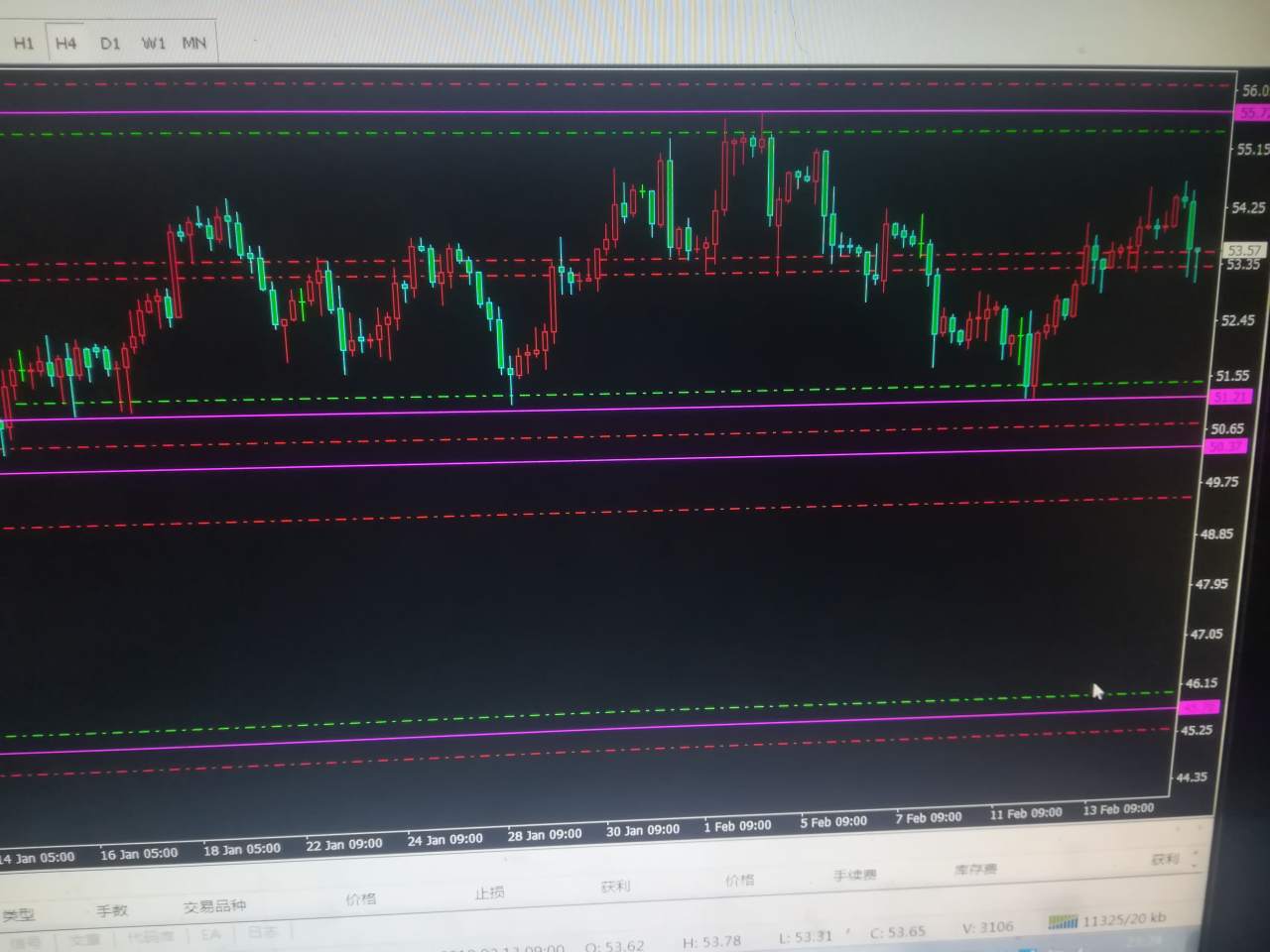(1)回辙54.54建多头头寸.止损53.84.盈利目标:57.50左右(4:1盈亏比)