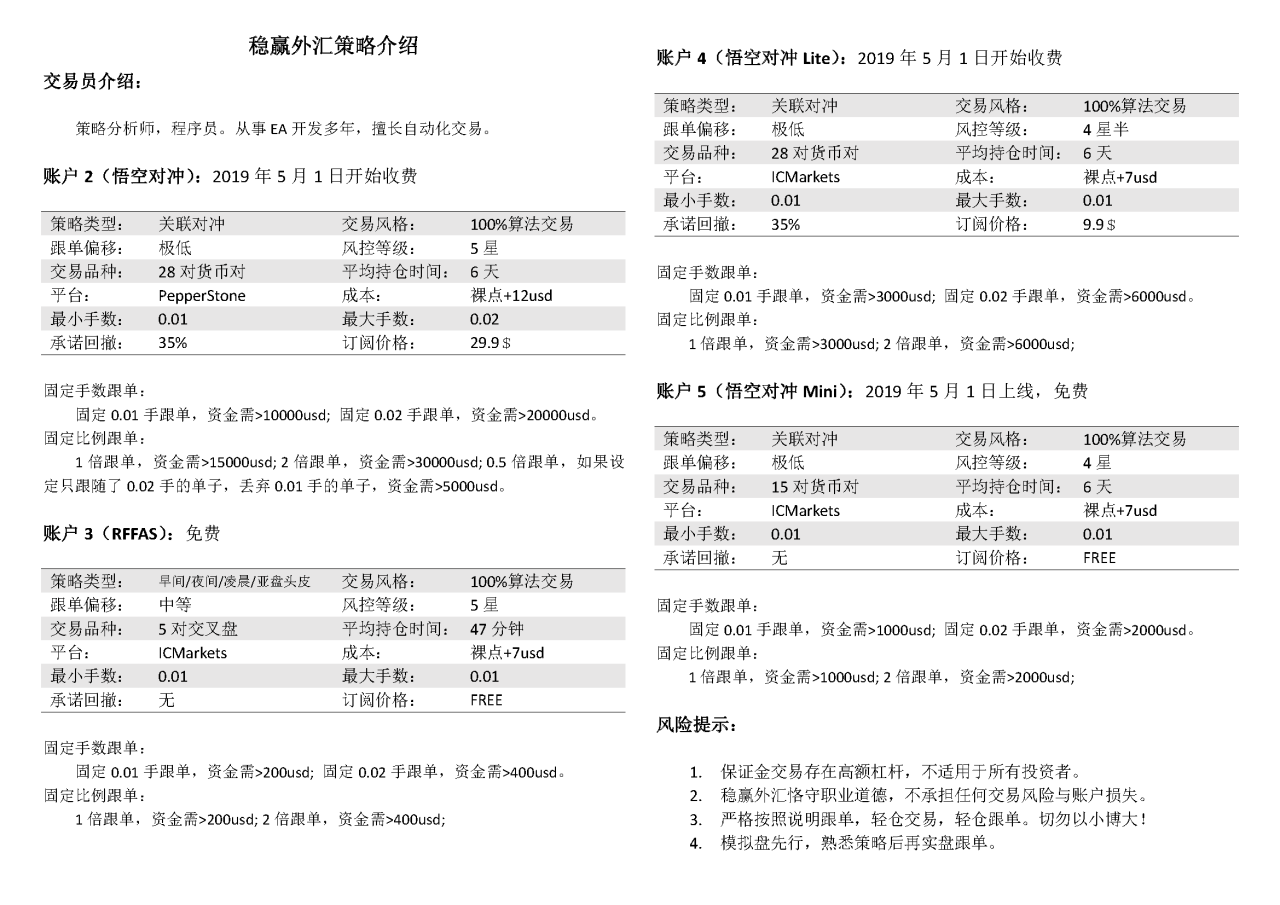 大家好,今早信号都已经恢复了,大家可以正常跟单了。截至到现在我的2号账户有291人跟单;3号账户有18人跟单,4号账户有56人跟单。5号账户争对1000usd左右的小资金,将于2019年5月1日上线。5号账户上线当天,2号与4号账户开始收费,分别定价29.9美元与9.9美元。所有跟单者,务必看下图片中的策略介绍,严格按照建议资金跟单,切勿以小博大!不了解我的策略的,可以注册模拟盘跟单,还可以免费跟单2个月左右,了解熟悉后再实盘。