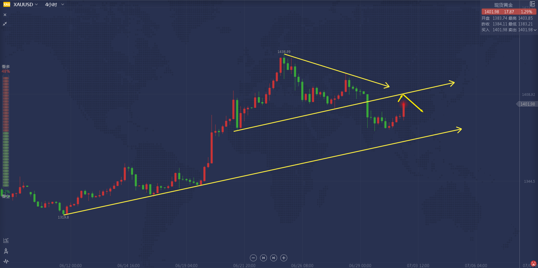 $WTI$ 7/5日晚间提示:原油上贴给出56.9/57.0空,目前开始过利中,当前56.4,即将兑现第一目标。黄金数据前明确给出分析,1410多空分水岭,而跌破就是空头。