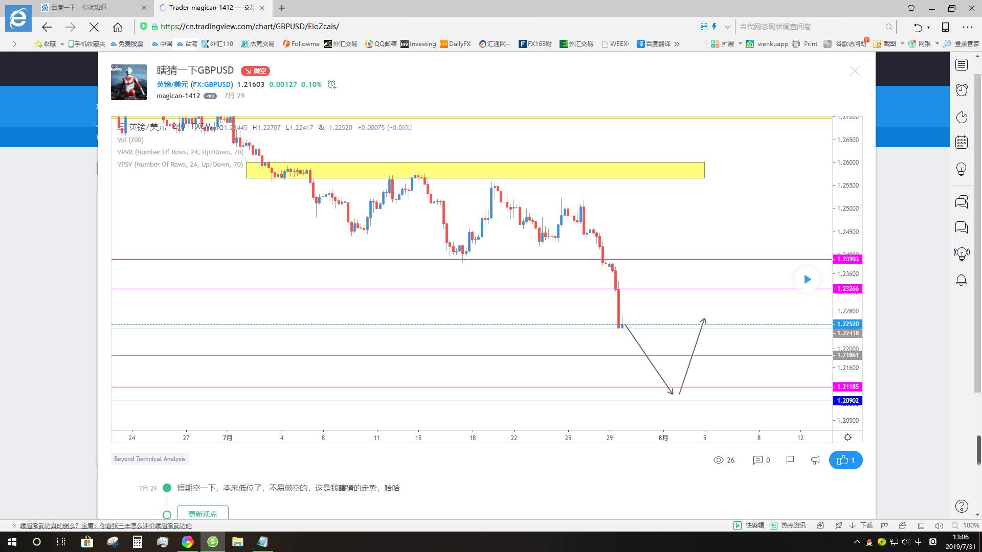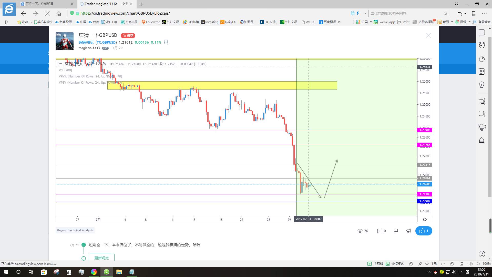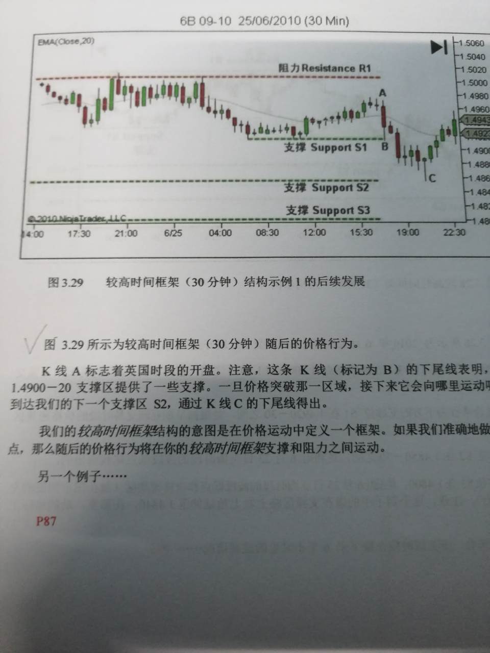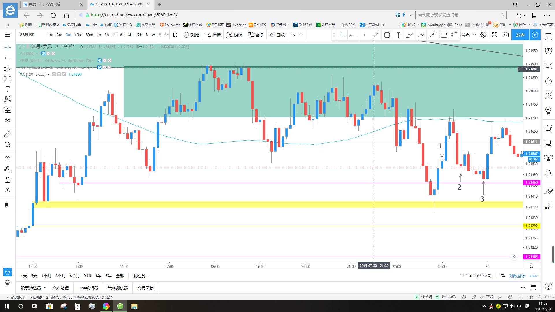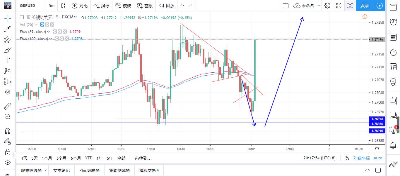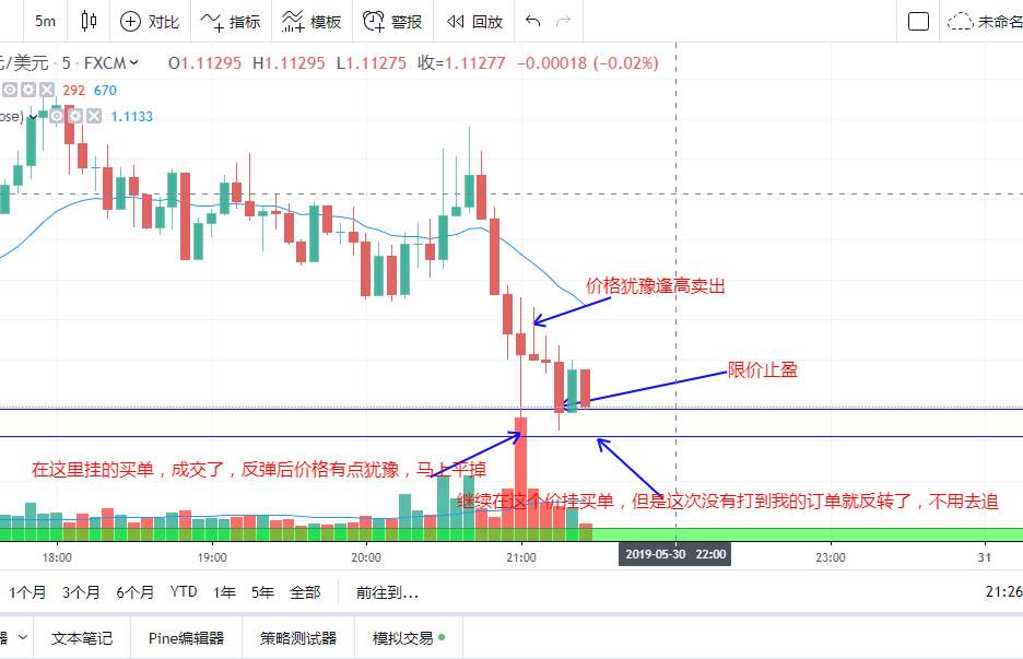 昨天晚上在黄色区域短线做一次多,预计风险收益有8倍以上,这买卖都不做那你还做什么,因为是短线嘛,就得看着,把我止损了,收盘收蓝色pin bar ,看来反弹蛮有力量的,收盘后马上进,因为预计有3倍风险收益,是个合算的买卖。然后上涨,看见1号蜡烛长阳却创不了新高,才刚起步就出现肾虚的表现,先了结再说拿下1.5倍风险收益。出场是有点早了,这里没有考虑到价位和趋势,长阳没有创新高这个理论应该用在下降趋势和高位非常有效,我本来就是个半吊子。但是在低位出这种信号也说明多头底气不足,2号蜡烛收盘后出现反转信号,在高位供应区又有均线,我一般不用均线,短线PA交易的话调出来辅助一下,所以卖出,下跌到3号蜡烛,前4分钟价格一直没有突破mother bar,最后一分钟才创mother bar的新低,创新低非常重要,说明有人愿意以更低的价格成交,这个新低不是你我说在那里卖就会创的,这些人他们是对市场走势是有个预见性的,最后一分钟才创新低,说明空头有出现心虚的表现,但是还不能急着了结,因为刚才价格创的新低,所以后市走势价格必须破刚才那个低点。还有下一页