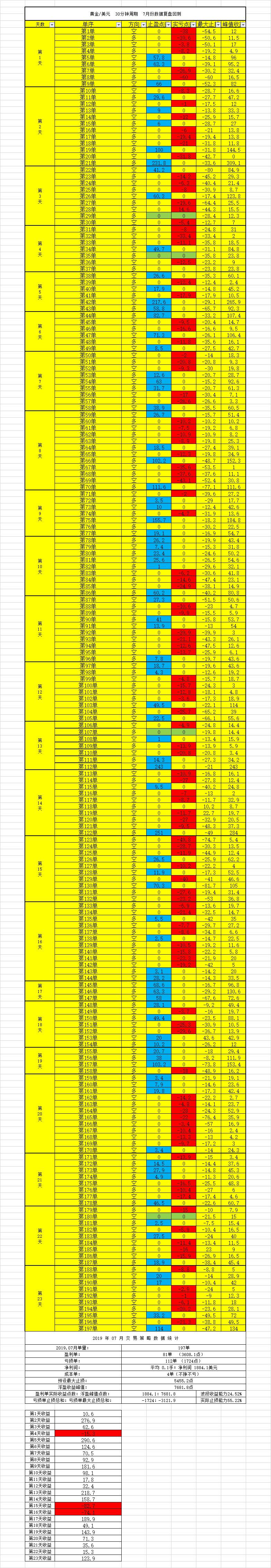 按照最新策略,回测2019年7月所有交易日交易数据-黄金/美元 30分钟周期