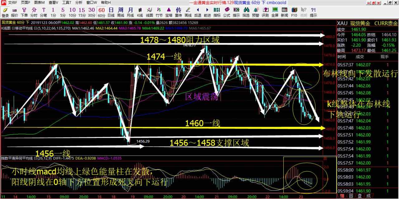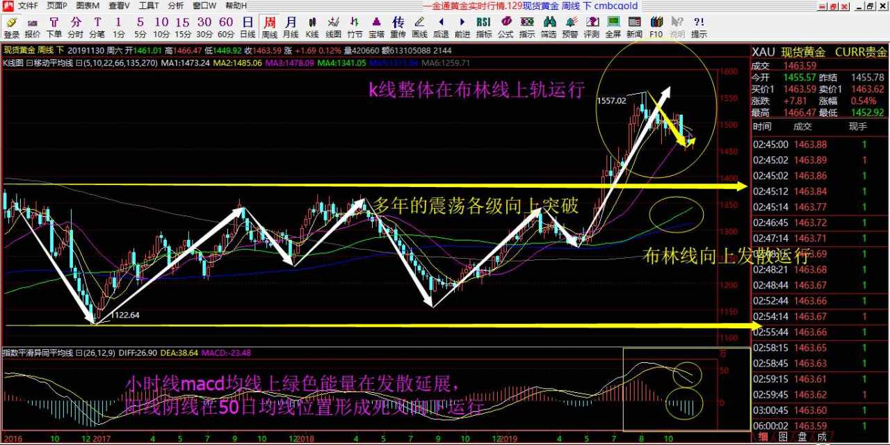 再来看日线:日线上看,目前布林线在向下拐角平行运行,k线整体在布林线下轨运行,macd均线上红色能量柱在发散,但是目前在收缩变短,阳线阴线在0轴下方运行,即将粘合在一起,看形成金叉还是死叉:形成金叉的话,日线综合来看,自1266一线开启强势反弹后,连续破位1300整数关口,1375几年未破的高点,1400整数关口,1500整数关口,最高到1557一线遇阻回落,最低回落到1445一线,随后在1450-1500之间震荡;目前日线关键看布林线压制位1485-1490区间能不能突破,再次站稳1500一线;