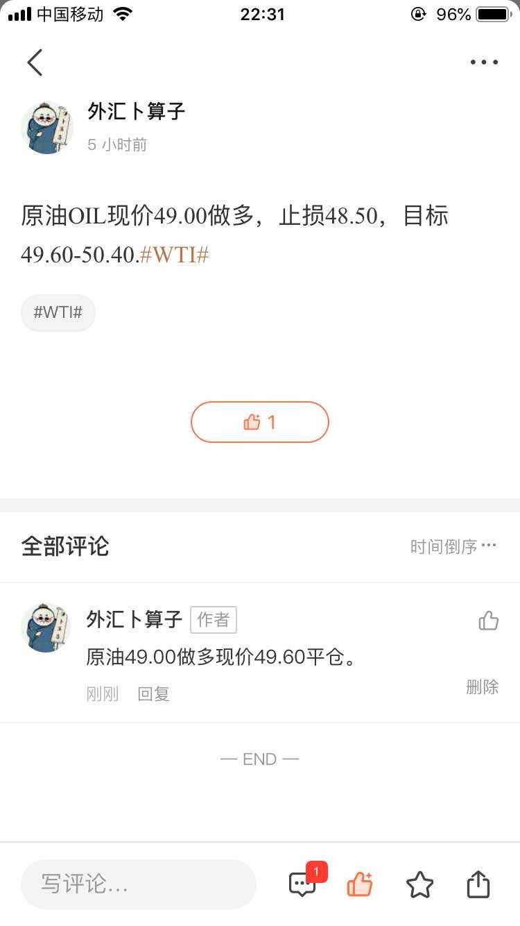 原油49.00做多现价49.60平仓。#WTI#