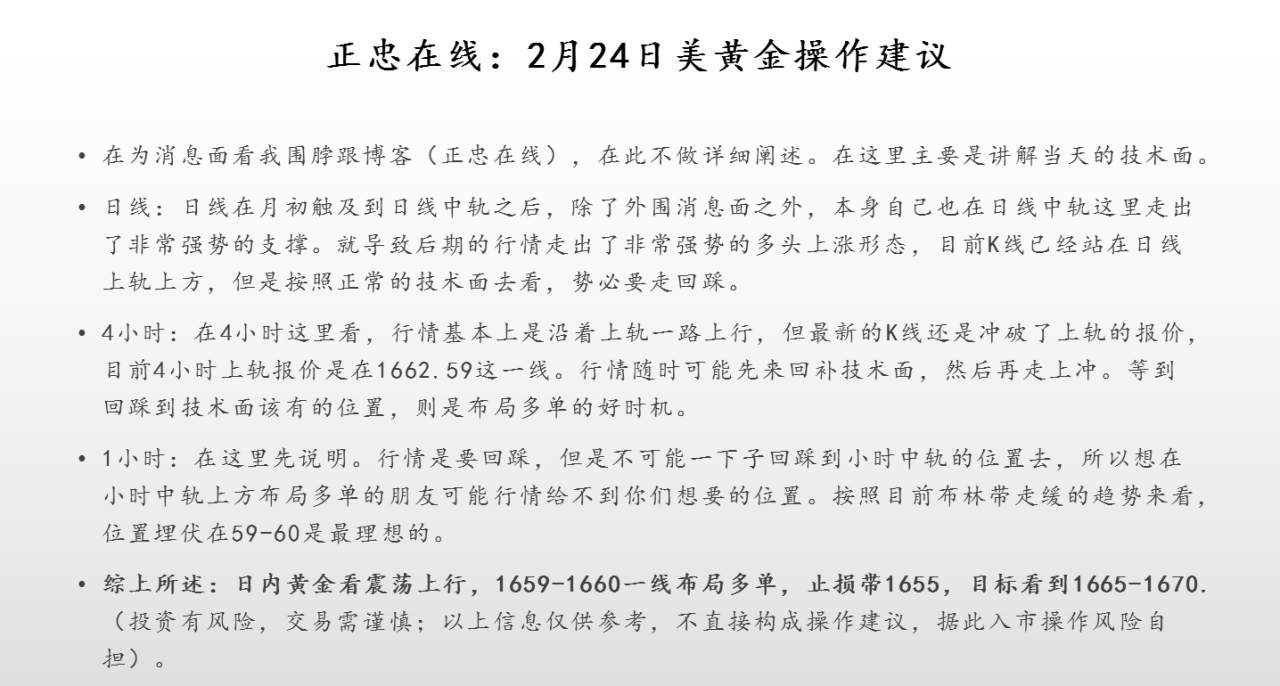#WTI# 正忠在线:美原油期货1月17日操作建议日线图:前期因为消息面的刺激暴涨之后,行情随之回踩,本身本周三API数据也是利空,大方向其实都看空。但是由于周三的EIA数据利多,进而带动行情沿着58一线展开了支撑,并逐步向上试探。按照目前的走势,下周的行情有非常大的可能性去试探日线中轨60一线,目前日线中轨的走势趋于平行,短时间来看,报价不会有很大的变化。4小时:4小时图这里布林道通道在收窄,且不断震荡,但是要留意的是目前已经成功站稳中轨上方。目前的行情说到底就是在孕育一波新的行情,如果没有明显的利空因素的前提下,预计行情将会去试探4小时上轨。目前4小时上轨报价是在58.99这一线。1小时:小时图目前布林带通道已经打开。现在实际上走的就是震荡上行思路。可以很肯定的说,在1小时中轨这里已经形成了非常强烈的支撑,行情势必会沿着这一线走震荡上行。 综上所述,日内原油持有震荡上行的走势思路。可以依托1小时中轨这里布局多单。(投资有风险,交易需谨慎;以上信息仅供参考,不直接构成操作建议,据此入市操作风险自担)。