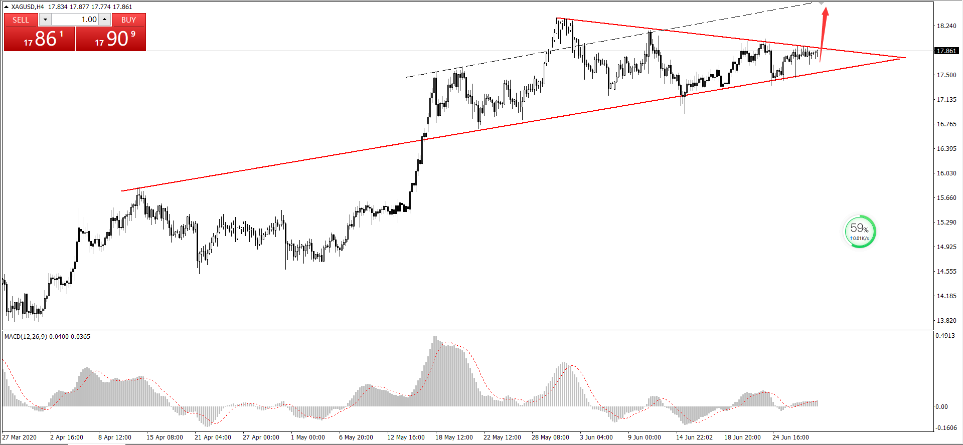 XAUUSD白银走势分析,图中选取4小时级别周期,三角形末端整理,即将迎来技术性的破位变盘行情。三角形态内白银依旧受到下降趋势线压制,不过白银高位整固,短线走势偏多,MACD多头量能堆积,看涨意愿较强,尤其近期全球新冠感染病例持续增加,打击了有关全球经济迅速复苏的乐观情绪,因此,贵金属黄金白银的避险买需得到增强。目前白银的整体交易思路以低多看涨为主,欧盘时段,白银若是成功上破17.9一线压制点,那么白银后市将大概率出现拉升走上升通道行情。激进者17.8一线买进。(以上趋势预判具有时效性,具体交易以实盘为准。)