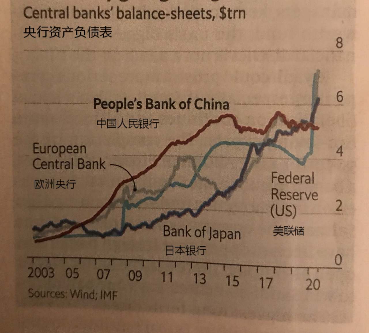来自《经济学人》的图:在杰克逊霍尔会议前夕,中国人民银行、日本银行、美联储、欧洲中央银行的近期资产负债表的扩张。#经济# #杰克逊霍尔大会# #欧洲经济#
