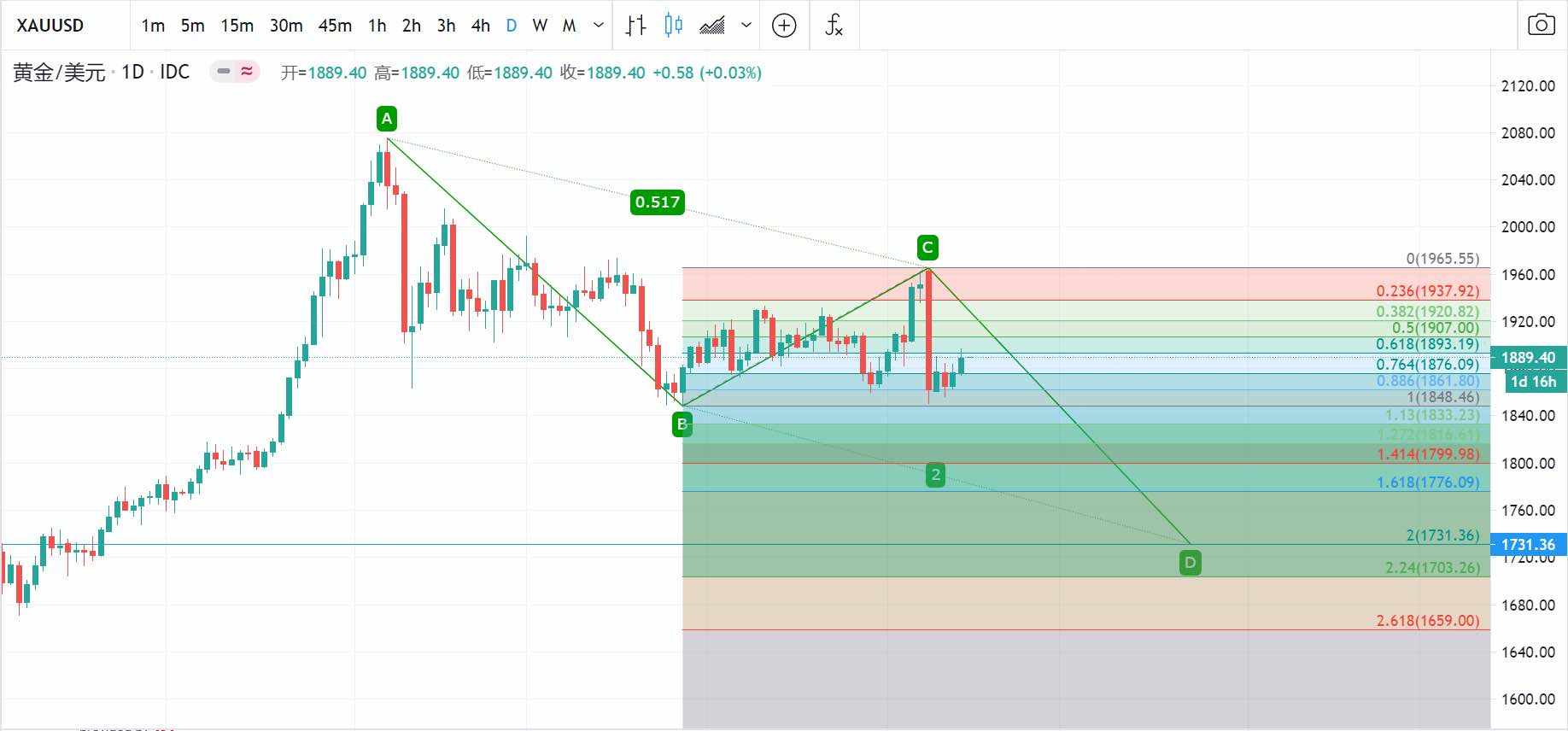 #创作者# 黄金价格日线图显示,目前金价在关键支撑价格1838.40位置。是上涨走势在38.2%是斐波那契回档1838.40价格。如果日线上能够企稳1838关键价格,则将鼓励金价进一步收复至23.6%斐波水平1928价格,价格上破后甚至有望进一步挑战2000美元/盎司心理关口。