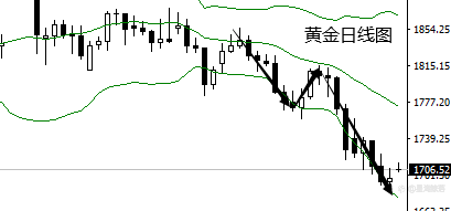 1图为黄金日线图,经过上周非农周的影响,黄金整体的走势一直在布林带下轨运行,从上个月中旬开始黄金下降趋势就日渐明显,上周非农周基本在下轨线运行几度跌破下轨线回弹。