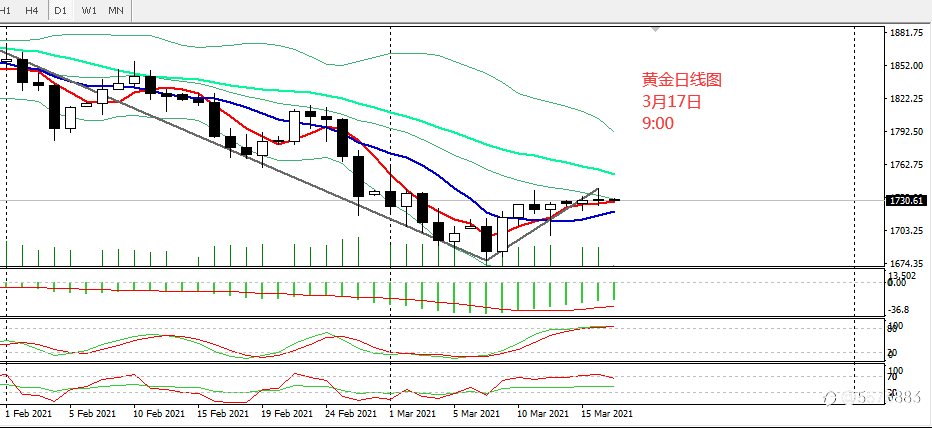 金价周二(3月16日)以小阳十字星收线,主要原因受市场等待美联储两天会议的政策导致观望情绪浓厚。其中开盘1730一线,最低回调1726,美盘时段快速上攻一波1741受阻再次回调至1726上方,最终收于1731附近;COMEX 4月黄金期货收涨0.1%,报1730.90美元/盎司。