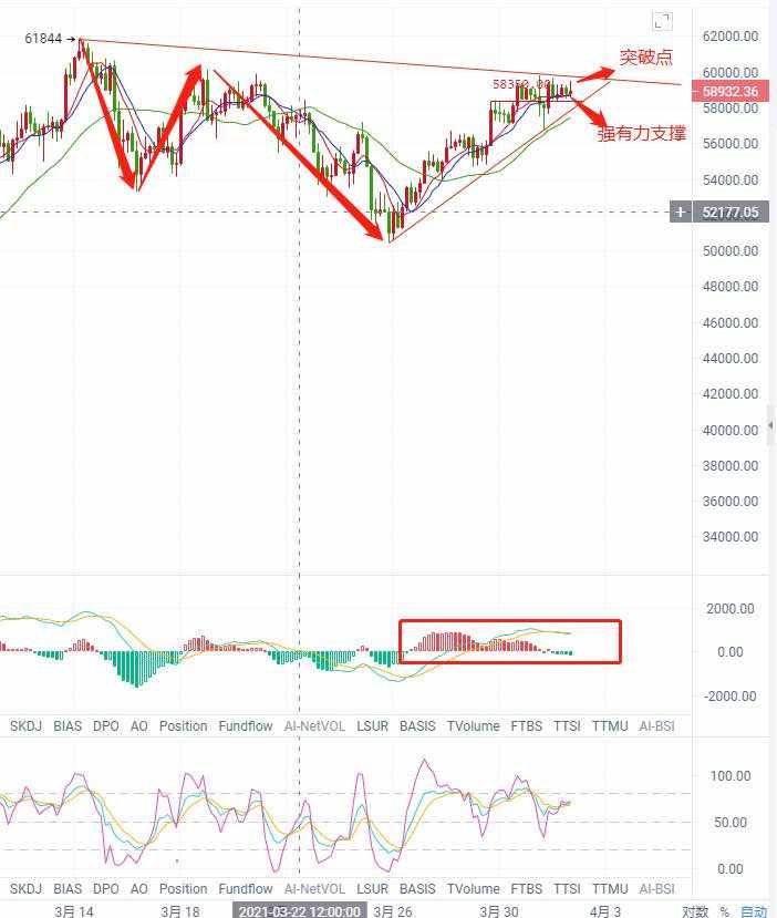 比特币今日凌晨回跌500美刀左右,试图在冲击60000新高,,十日均线承载,七日均线往上方运行,K线处于拉升的趋势,短时间回踩力度不会太大,下方在58500一线位置有强有力支撑,KDJ形成金叉向上,空头明显动力不足,多头趋势强势,综合多方面,上涨力度加大。给到59500多单 看向60500 防守58800.行情瞬息万变