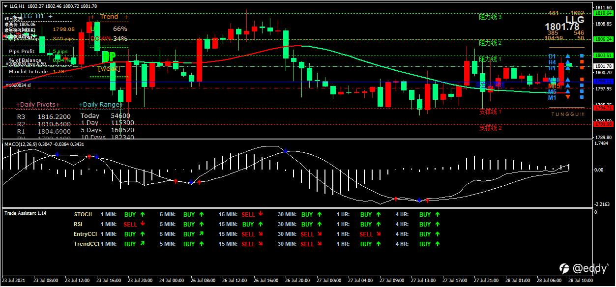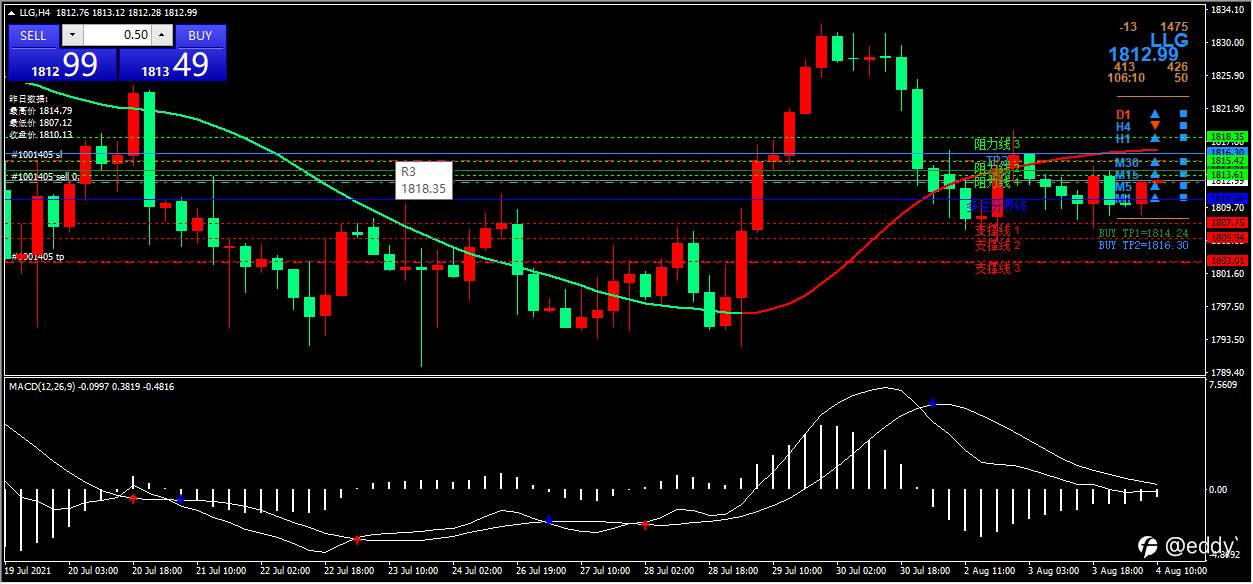 现货黄金在转折点1813之下承压看跌,留意下方支撑点1798和1792,若上探1813,则关注第一阻力1818,若继续上行可关注1823阻力。
