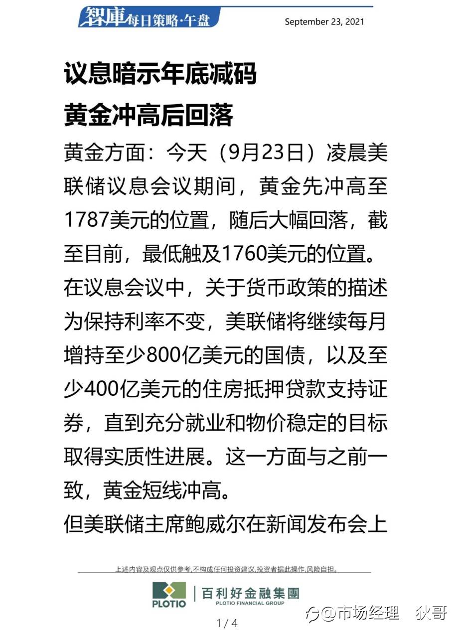黄金方面:周三(10月20日)美联储发布最新一期经济报告褐皮书。这份褐皮书是美联储决策者在11月2-3日议息会议前准备的系列简报中的一部分, 对美联储是否在11月会议上正式宣布缩债有着一定的影响。 褐皮书"坚称”美国经济在9-10月保持温和至适度增长,并继续对通胀预期保持乐观。