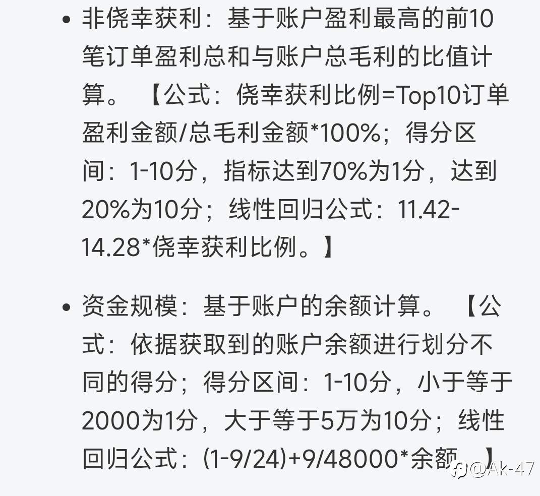 盈利、风控、稳定的评分都满分或几乎满分。非侥幸营利需要盈利的前10单占比低过70%才才加分,这个得将来随着大单盈利单数增多才能实现,资金规模就没办法了,得2000美元才开始加分。整体不错了,随着时间推移,这个账户综合评分应该比9#小账户分高,应该要超过8分。