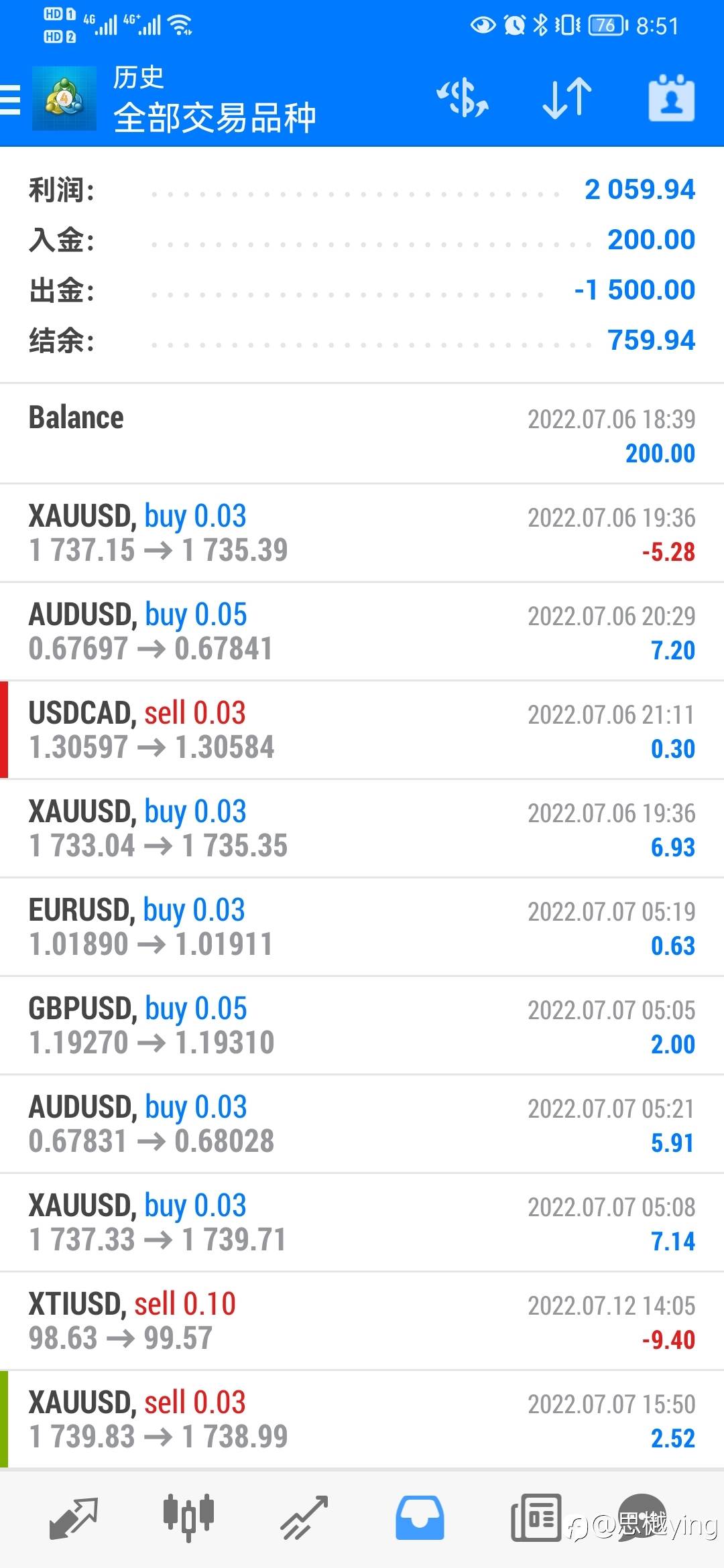 7月6日开始入金200,每星期盈利出金,这个月总体盈利2000,今天会出金500,下周账户200美金出发