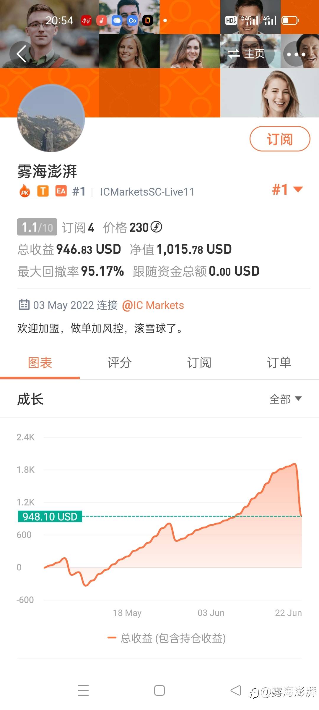 风控与盈利的完美结合,跟随做单,每单设有隐形止盈止损,不用害怕爆仓风险,回撤较小,利用复杂的计算方法和超过五年的回测,稳定盈利且存活性极强。保持耐心,给你不一样的飞升。4号账户200美金做起。