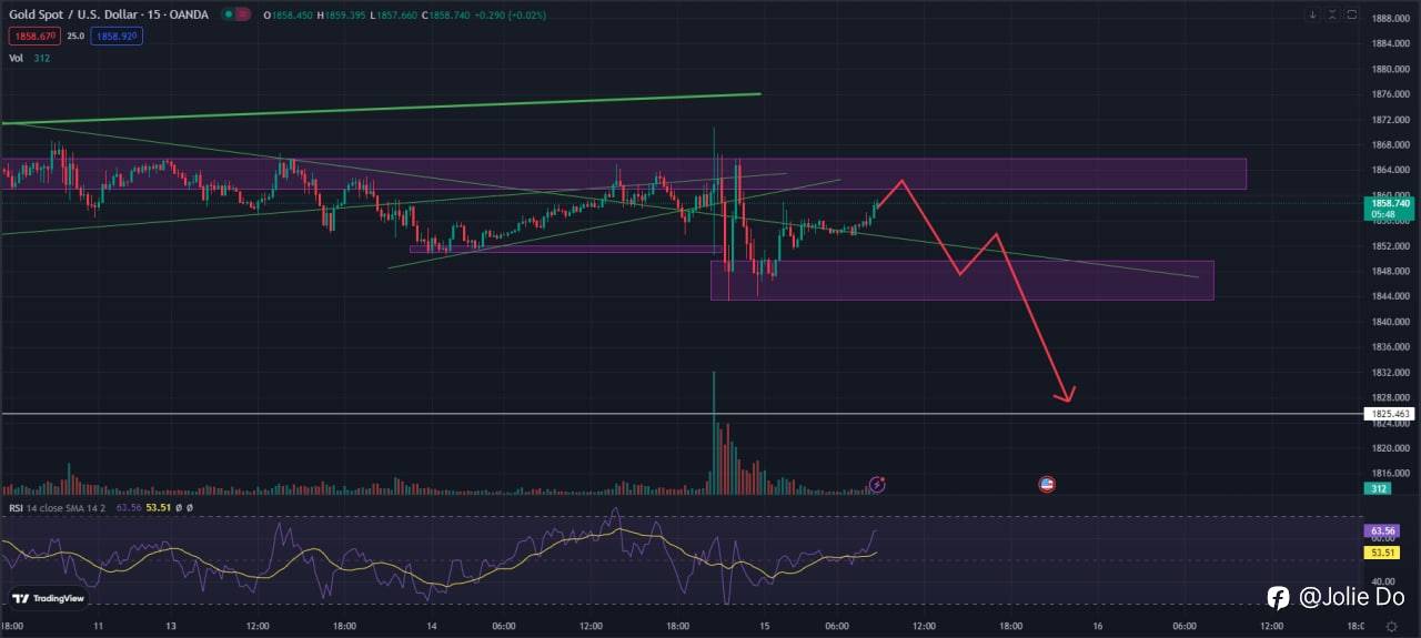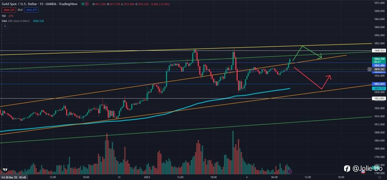 +2nd (red arrow): dropping down to the lower orange trend line, let’s wait to see how the candlestick closes, then we can sell around 1842 SL 1845 TP 1836, 1830.
