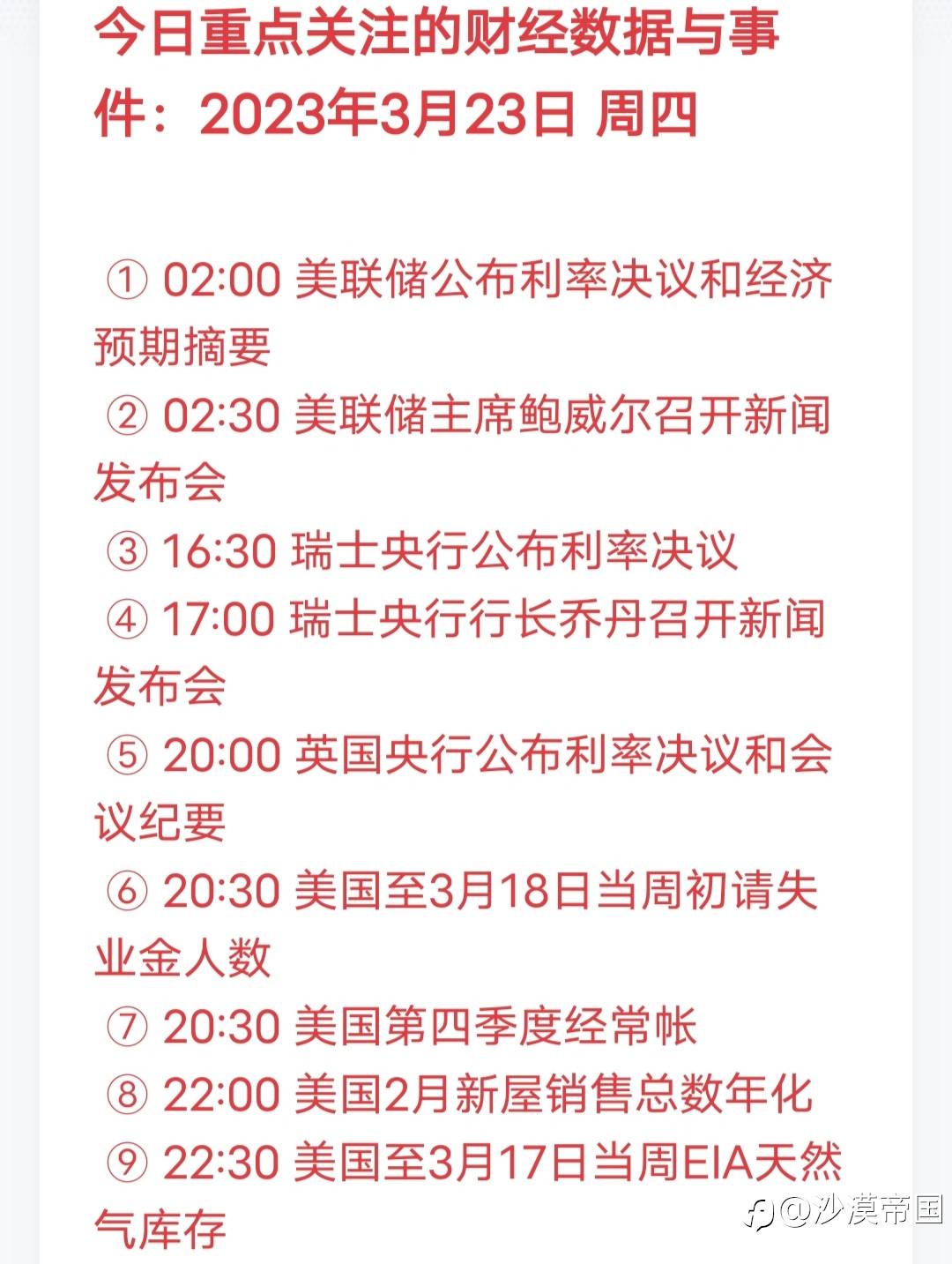 今日重点关注的财经数据与事件:2023年3月23日 周四