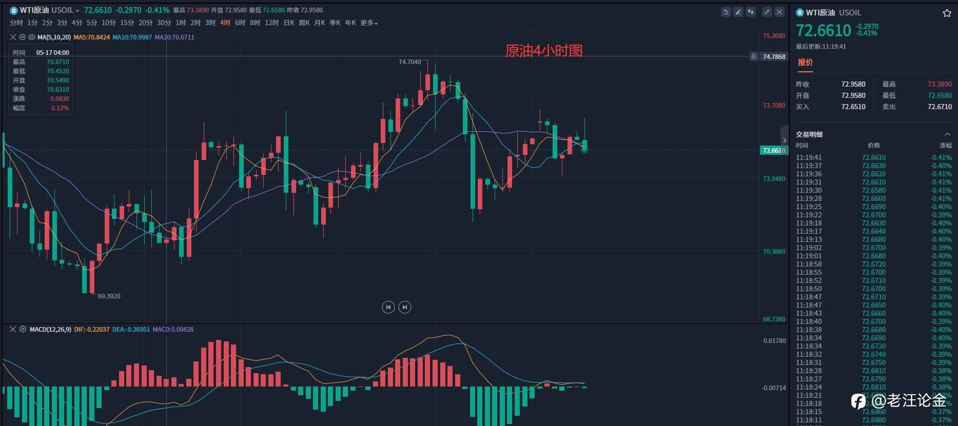 原油上周继续十字K线震荡收盘,整体空间走得不大,维持在前一周的区间内运行。周线双十字K线窄幅整理。日线方面,上周连续的阴阳互换,并没有突破性的选择,本周开盘依旧在区间中性值,周初仍要留意区间的突破。4小时级别:震荡;KDJ金叉运行,MACD初步金叉,油价在上涨趋势线附近获得了一些支撑后反弹,目标初步收复布林线中轨,后市有望重新试探布林线上轨74.0附近压力,如果顶破该压力,那么后市里75的压力也就不远了。可考虑看涨信号,如果不能顶破该压力,就需要像周一提防冲高回落。今日的行情72.4-72.6依旧多,止损72.0,目标看73.5.破位看74.0。遇阻力冲不破直接反手看空即可。