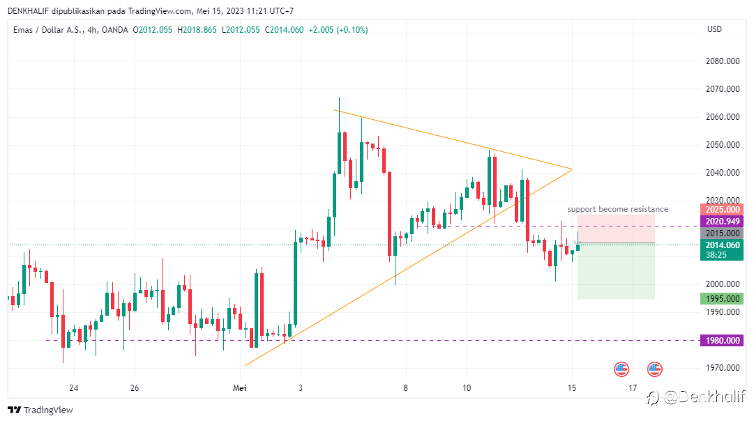 XAUUSD sebelumnya sudah menembus pola triangle dan juga reject di area resistancenya di harga 2020-an. Saat ini harga bergerak sideways antara 2020-2000an, selama harga masih belum bisa menembus area resistance di 2020-an potensi bearish masih tinggi dengan target harga bergerak ke area support di 1980an.