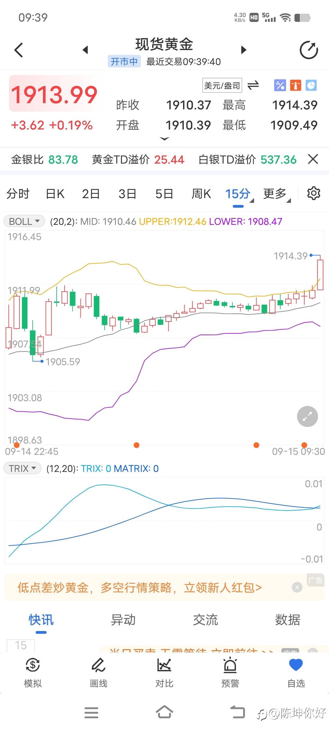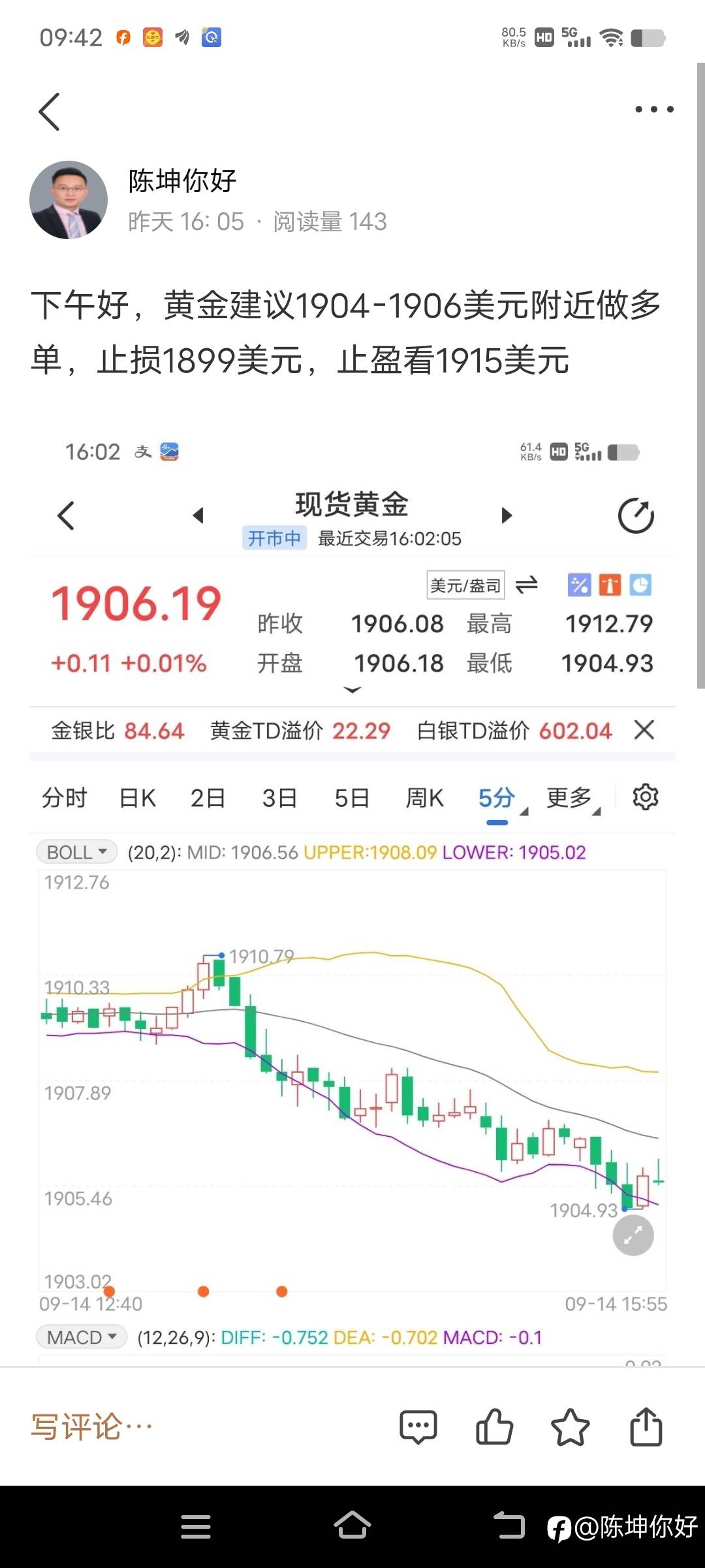 黄金现在1914美元,黄金昨天1904-1906美元多单获利,稳健可以出局