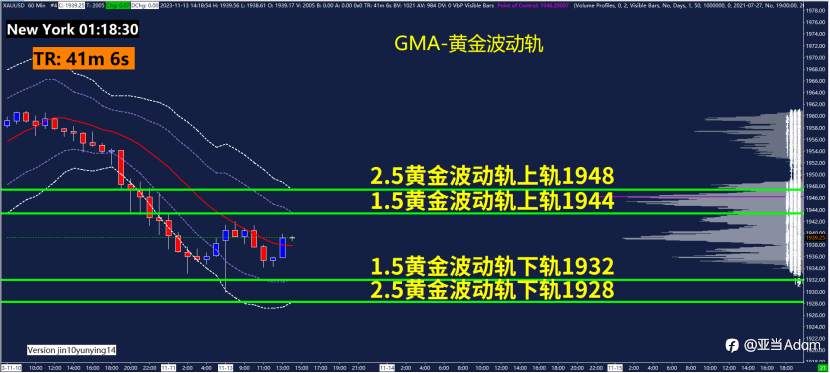 60分钟GMA-黄金波动轨指标关键点位1928、1932、1944、1948,可以关注这些位置附近的波动轨变化。黄金波动轨是依据波动率计算测算出来的,在震荡行情用法为触轨即可能反转!重点关注1.5倍波动轨和2.5倍波动轨位置。