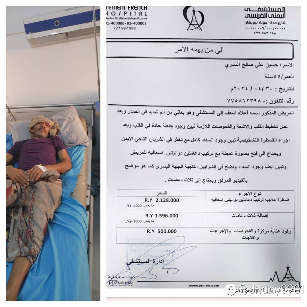 المريض حسين علي صالح الساري حصلت له جلطة حادة في القلب . وتبين ان عنده انسداد كامل وتخثر في الشريان التاجي الايمن وانسداد في الشرايين التاجية اليسرى.