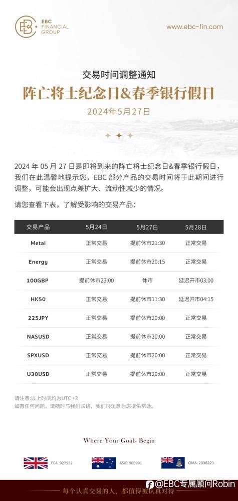 交易通知:今日阵亡将士纪念日,贵金属及能源,指数产品会提前休市,还请提前做好安排,谢谢。