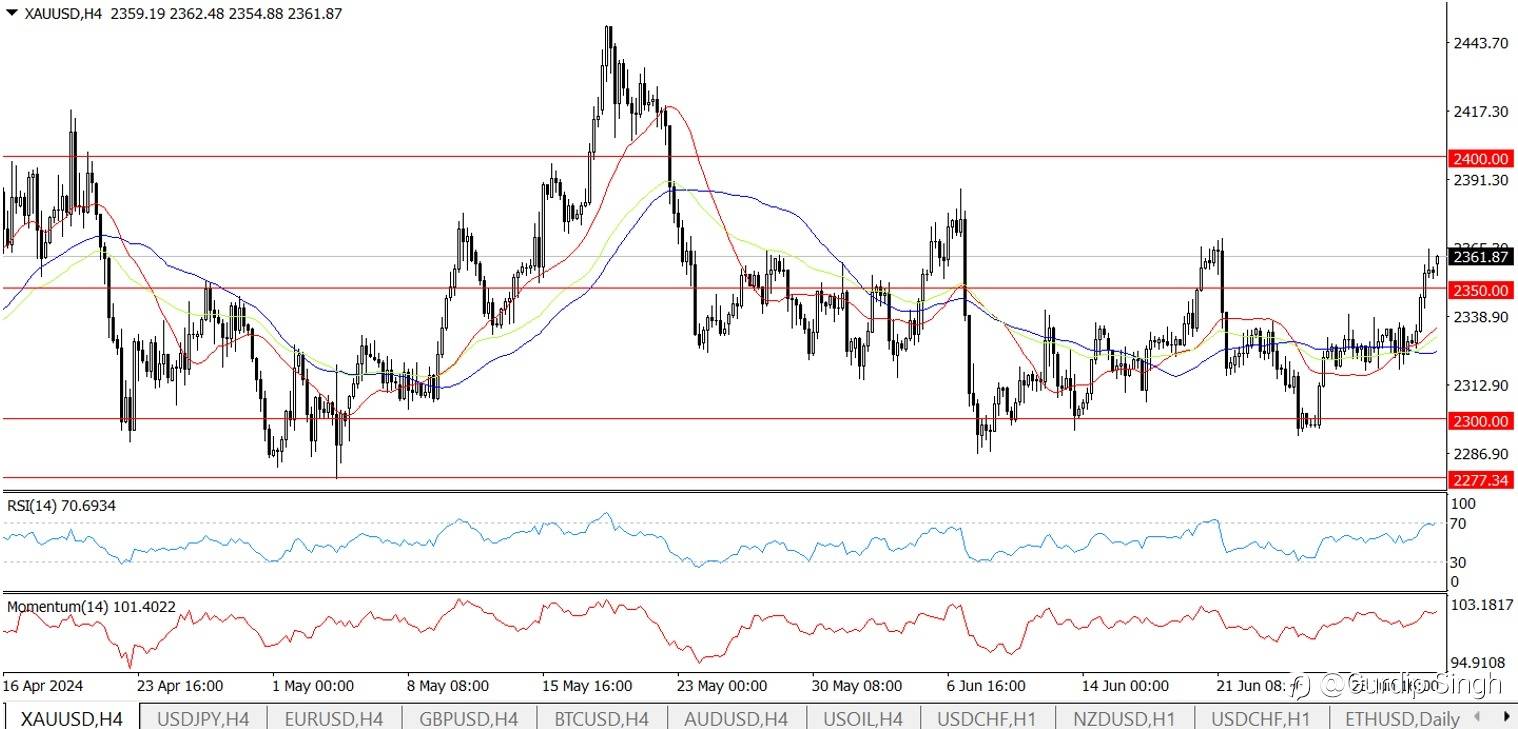 4-Hour Chart: The metal is above the 50% Fibonacci retracement level at $2,388.25, showing a bullish near-term bias.