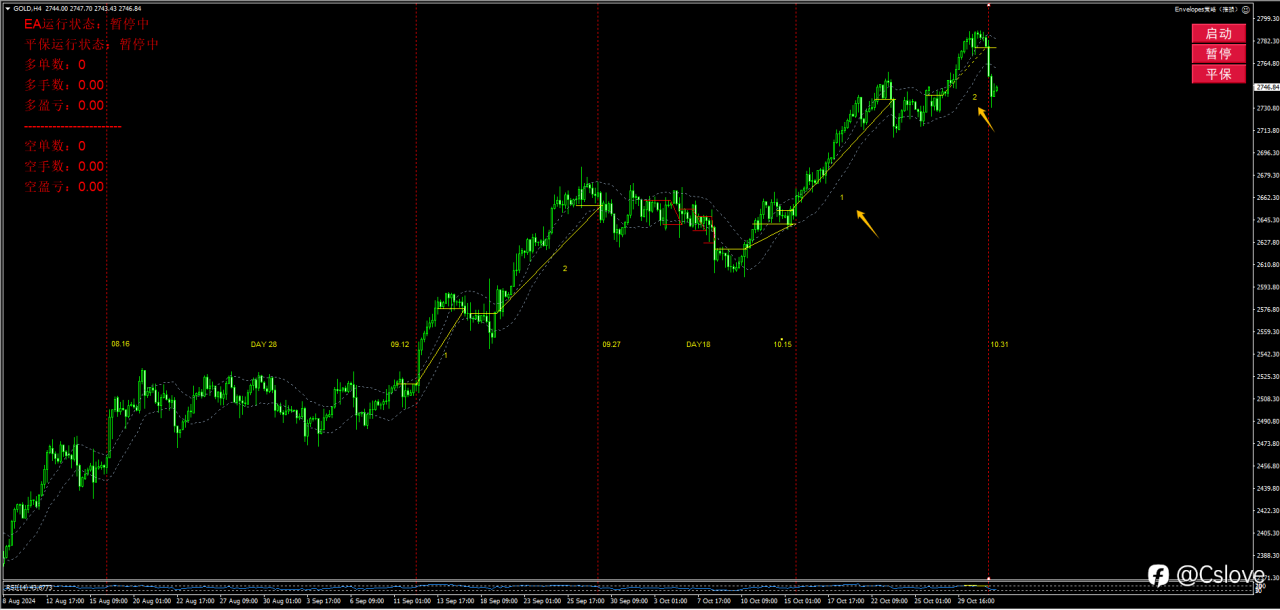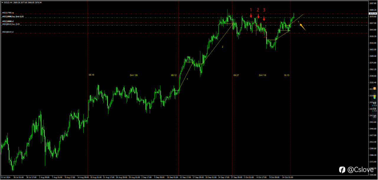 昨夜间美联储降息50个基点,黄金首次探顶尝试。但日线仍旧维持多头不变,我们会继续原来的短线多单计划。而四小时的k线拉大了下跌幅度,我们短线的时间有可能被延长。Last night, the Federal Reserve cut interest rates by 50 basis points, and gold tried to peak for the first time. However, the daily chart remains unchanged, and we will continue the original short-term long plan. The four-hour candlestick has widened the decline, and our short-term time may be extended.