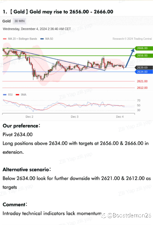 If the price of gold falls below US$2,605 (low on November 26), the subsequent downward trend will be confirmed, with a target price of US$2,550 near the end of the "C wave". In addition, the MACD indicator recently fell below the red signal line and is in the negative zone, sending a bearish signal and supporting the view that gold prices will decline in the short term.